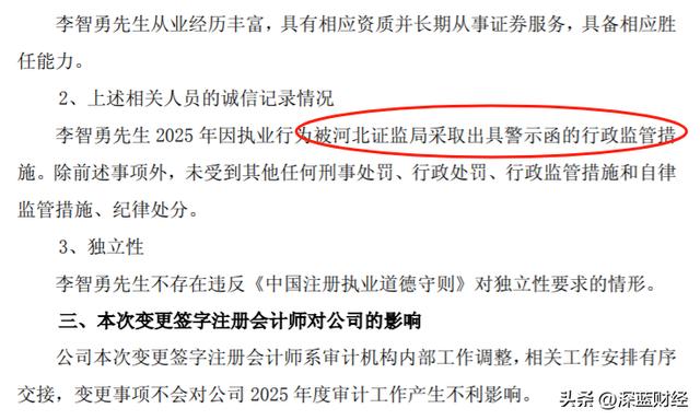 深蓝财经还注意到,就在年报公布前,为航天宏图提供审计服务的审计机构深圳久安会计师事务所,突然更换了签字会计师。而且,新任签字会计师李智勇,曾在2025年因执业行为被河北证监局采取出具警示函的行政监管措施。这次临时换人,颇有些耐人寻味。