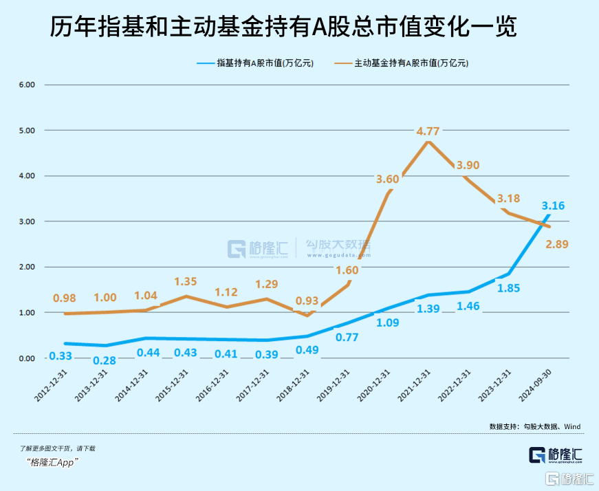Wind数据显示,截至2024年三季度末,被动指数型基金(含指数增强型基金)持有A股市值达3.16万亿元,首次超过同期主动权益类基金2.89万亿元的总市值。