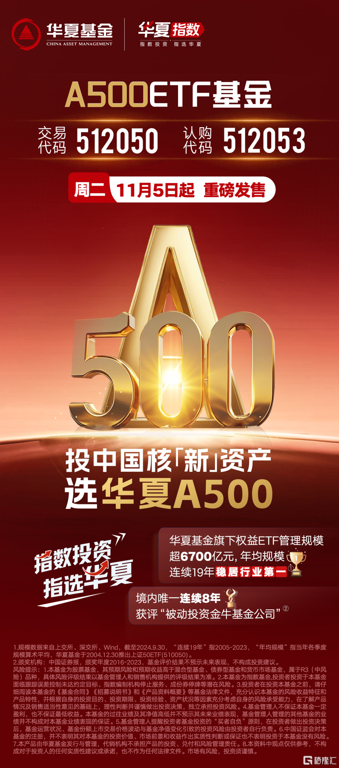 作为A500ETF基金(认购代码:512053,交易代码:512050)背后的基金公司,华夏基金致力于做最好的权益指数产品供应商和管理者,已经连续19年规模第一,是境内唯一一家连续8年获评“被动投资金牛基金公司”奖的基金公司,在产品费率、指数跟踪、指数交易策略等行业领先。