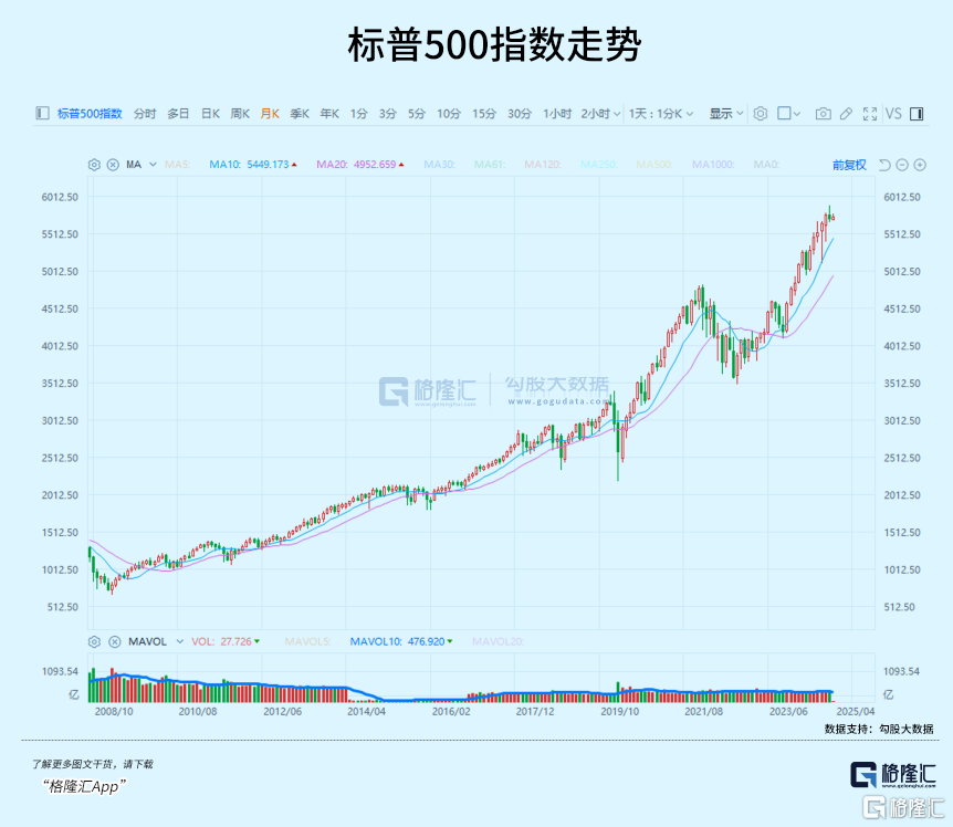 从2008年金融危机以来,标普500指数从1000点上涨至目前的5700多点,累计涨幅达近5倍。