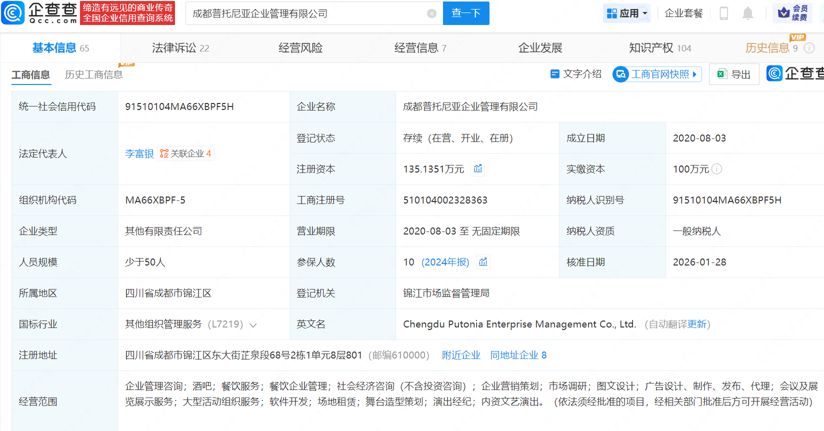 该公司成立于2020年8月,法定代表人为李富银,经营范围包含企业管理咨询、酒吧、餐饮服务等,现由天津漫吉企业管理合伙企业(有限合伙)、天津好吉企业管理合伙企业(有限合伙)、上海铠言企业管理有限公司及上述新增股东共同持股。