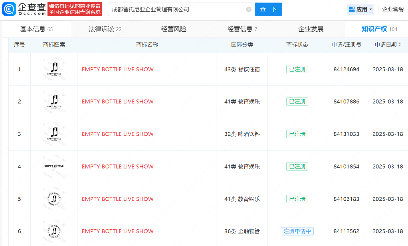 企查查信息显示,该公司曾申请注册多枚“EMPTY BOTTLE LIVE SHOW”商标,国际分类包括餐饮住宿、教育娱乐、啤酒饮料等。