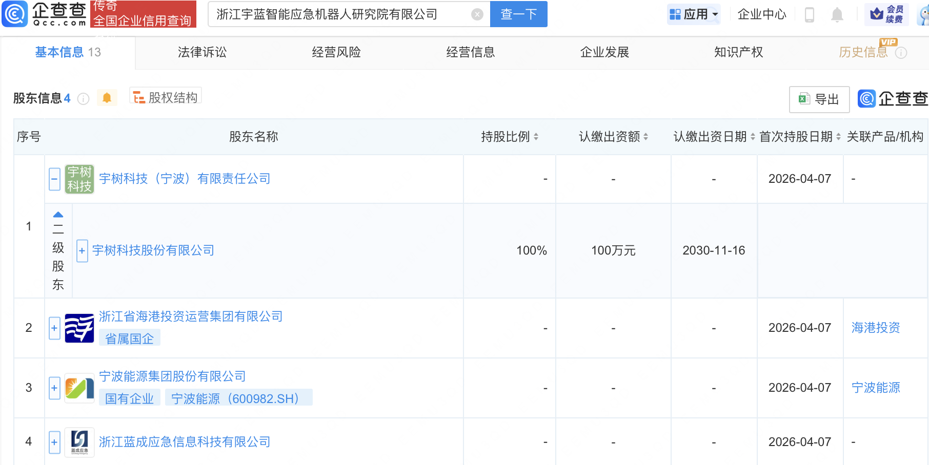 企查查APP显示,近日,浙江宇蓝智能应急机器人研究院有限公司成立,注册资本1000万元,经营范围包含:智能机器人的研发;人工智能基础软件开发;人工智能应用软件开发;物联网技术研发;智能控制系统集成等。企查查股权穿透显示,该公司由宇树科技股份有限公司全资子公司宇树科技(宁波)有限责任公司、宁波能源(600982)等共同持股。