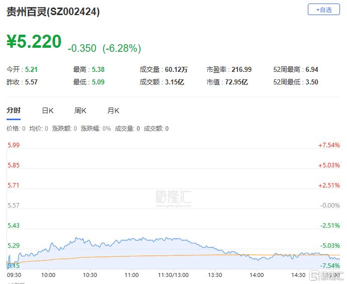 贵州百灵跌6.28%至5.22元,总市值跌至72.95亿元。