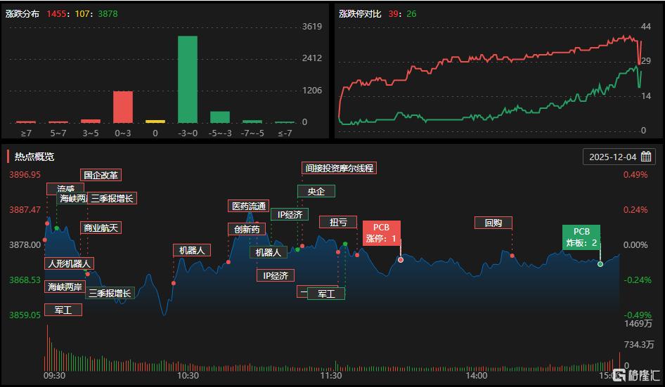 12月4日,A股主要指数涨跌不一,沪指跌0.06%报3875点,深证成指涨0.4%,创业板指涨1.01%。沪深两市成交额1.55万亿,较上一个交易日缩量1210亿。