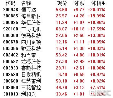 人形机器人板块掀涨停潮,恒而达、海昌新材、华伍股份20CM涨停,四川金顶、骏亚科技、和而泰、龙溪股份、睿能科技、日发精机涨停,江苏雷利、三花智控等上涨。