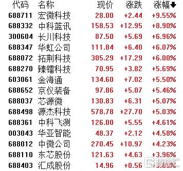 半导体板块走高,宏微科技涨超9%,中科蓝讯、长川科技、华虹公司、拓荆科技、臻镭科技、金海通、京仪装备等跟涨。