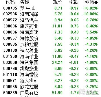 海南板块下挫,罗牛山、海南瑞泽跌停,海马汽车、康芝药业、海南高速、海德股份、京粮控股、神农种业等跟跌。