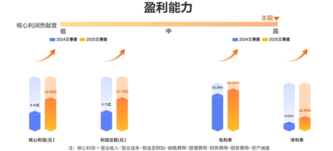 盈利能力方面,本期公司的核心利润对总利润的贡献较高,其中核心利润相比去年同上涨81.36%,利润总额上涨74.02%,毛利率从去年的53.39%上涨到今年的60.53%,净利率从去年的8.63%上涨到今年的16.99%。