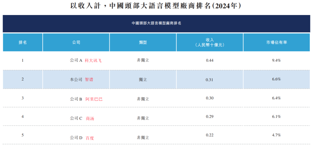 根据弗若斯特沙利文的资料,于2024年按收入计,智谱在中国通用大模型开发商中位列第二,市场份额为6.6%,仅次于A股上市公司科大讯飞(002230.SZ)。