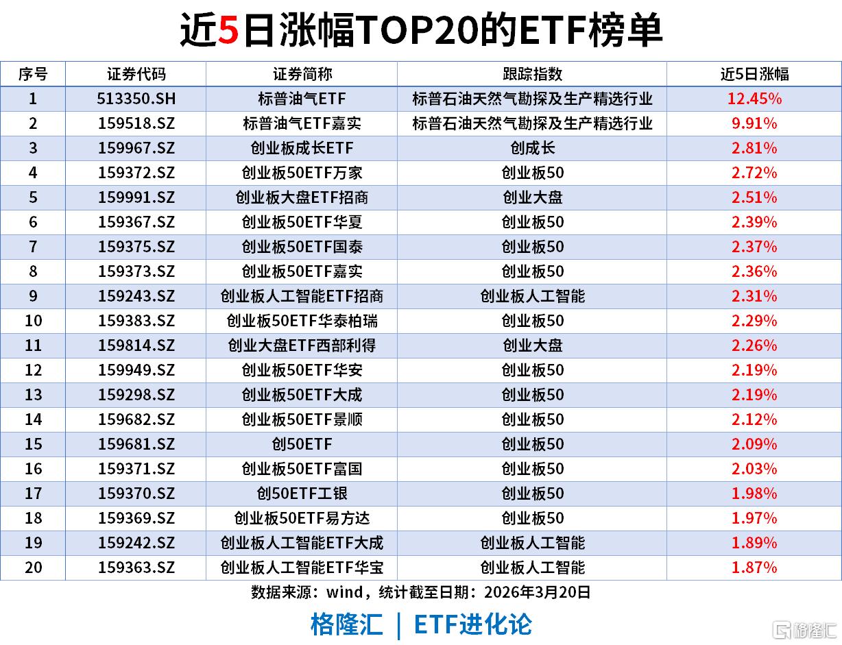 创业板成长、创业板50、创业板人工智能等成长类ETF涨幅在1.87%-2.81%,中小盘成长风格温和修复,但整体远弱于油气主线。
