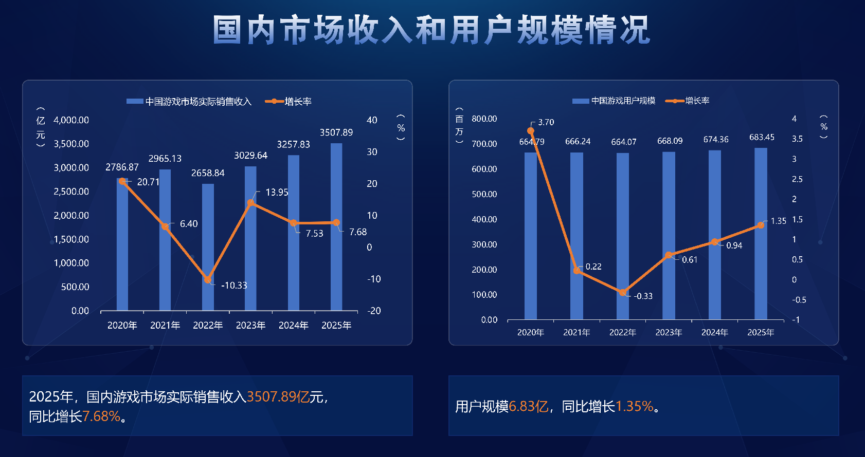 新鲜出炉的《2025年中国游戏产业报告》数据显示,2025年中国游戏市场持续增长,实际销售收入达3507.89亿元,同比增长7.68%;用户规模达6.83亿,同比增长1.35%,二者均创历史新高。