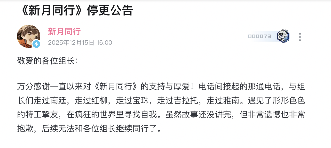 就在12月中旬,才上线一年多的二次元游戏(下称“二游”)《新月同行》突然宣布停止更新,玩家、游戏媒体纷纷刷屏表示惋惜——一款口碑佳作,竟倒在新年前。