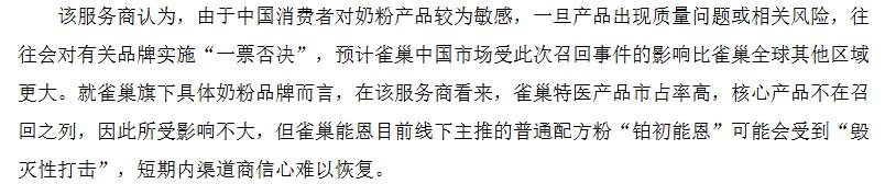 尽管雀巢集团声称召回产品占年销售额比例不足0.5%,预计对财务影响有限,但分析师们持更为悲观的态度。