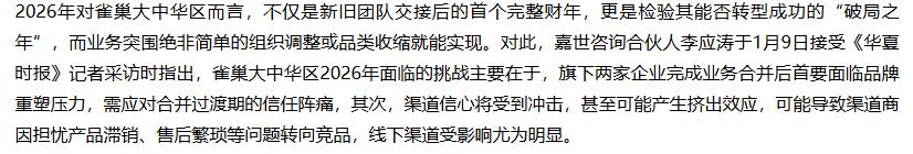 嘉世咨询合伙人李应涛指出,雀巢大中华区2026年面临的挑战主要在于,旗下两家企业完成业务合并后首要面临品牌重塑压力,需应对合并过渡期的信任阵痛。其次,渠道信心受到冲击,甚至可能产生挤出效应,可能导致渠道商因担忧产品滞销、售后繁琐等问题转向竞品,线下渠道受影响尤为明显。