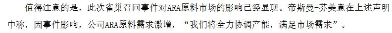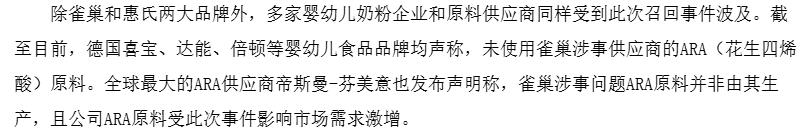 供应链层面也受到此次事件的深刻影响。随着帝斯曼发布澄清公告,市场将焦点转向国内最大ARA供应商嘉必优。