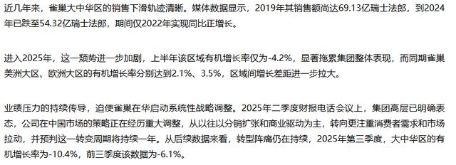 近年来,雀巢大中华区销售额呈现明显下滑趋势。据《华夏时报》报道的数据显示,该区域销售额从2019年的69.13亿瑞士法郎跌至2024年的54.32亿瑞士法郎,期间仅2022年实现同比正增长。进入2025年,这一颓势进一步加剧。上半年,大中华区有机增长率为-4.2%,显著拖累集团整体表现。相比之下,同期雀巢美洲大区和欧洲大区分别实现了2.1%和3.5%的正增长。到第三季度,大中华区有机增长率更是下探至-10.4%,前三季度累计为-6.1%。