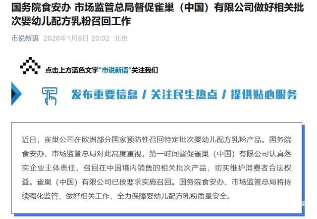 随后,中国市场监管总局发布公告,明确国务院食安办、市场监管总局已高度重视相关情况,第一时间督促雀巢认真落实企业主体责任,召回在境内销售的相关批次产品,切实维护消费者合法权益,并确认雀巢已按要求实施召回。监管部门同时表示,将持续强化监管,全力保障婴幼儿配方乳粉质量安全。