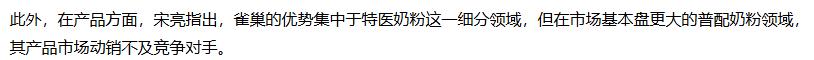 在产品结构方面,宋亮分析,雀巢的优势集中于特医奶粉这一细分领域,但在市场基本盘更大的普配奶粉领域,其产品市场动销不及竞争对手。