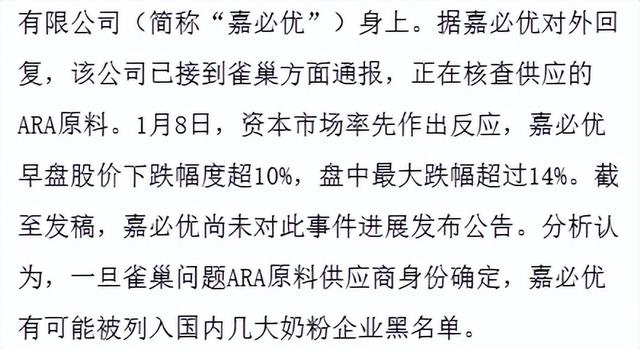 嘉必优在1月7日回应称,已接到雀巢方面通报,正在核查供应的ARA原料。有分析认为,如果嘉必优问题实锤,其服务的品牌可能都会受到波及,嘉必优很可能会被中国奶粉企业列入黑名单。