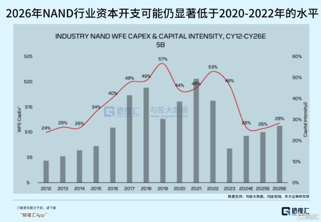 据2025年闪迪投资者关系日资料的预测,2026年NAND行业资本开支虽然较2023年低点回升,但仍显著低于2020-2022年的水平,产能扩张节奏比市场期待的要慢得多。