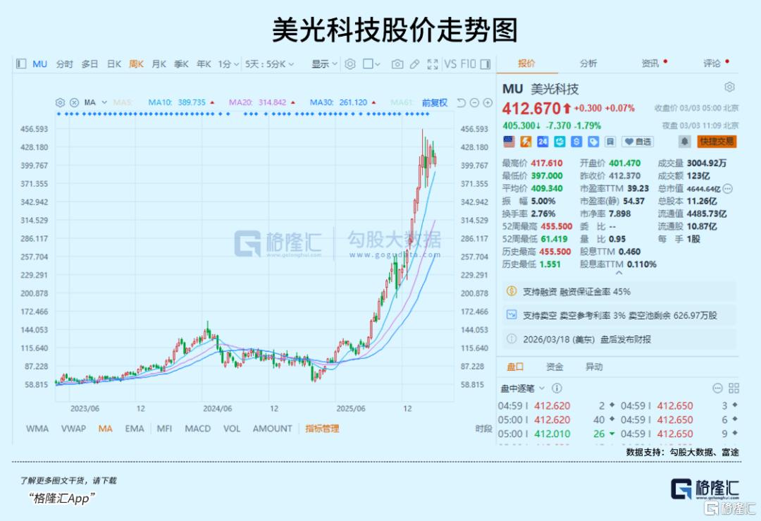 在美股市场,美光科技的股价自2025年4月低点起持续攀升,截至2026年2月中旬股价最高涨幅超过600%,市值一举5千亿美元以上。该公司2026财年Q1交出史上最强财报,HBM驱动业绩全面超预期,营收同比增长56.6%,净利润激增231%同比扭亏为盈,毛利率从2025年一季度的18%飙升至56%。