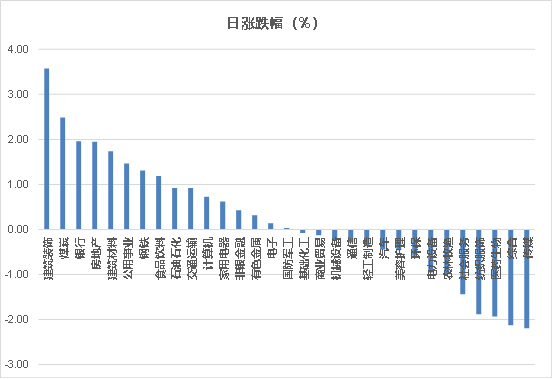 分行业来看来看,申万一级行业指数中涨跌各半,其中建筑装饰、煤炭、银行、房地产、建筑材料等和稳增长相关的低位板块领涨,传媒、综合、医药生物、纺织服饰、农林牧渔等行业领跌。