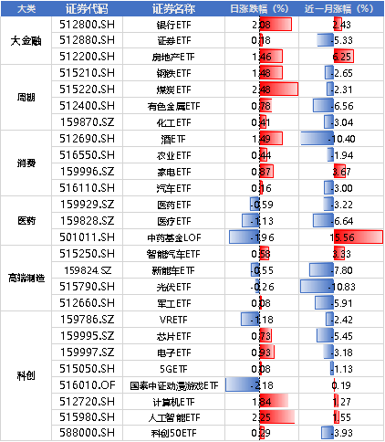 从场内ETF、LOF基金表现来看,大金融、周期大类板块表现强势。其中煤炭、人工智能、银行、计算机等ETF基金领涨。