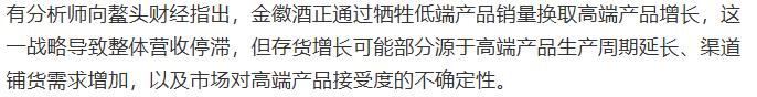 据《鳌头财经》报道,有分析师指出,金徽酒正通过牺牲低端产品销量换取高端产品增长,这一战略导致整体营收停滞,但存货增长可能部分源于高端产品生产周期延长、渠道铺货需求增加。
