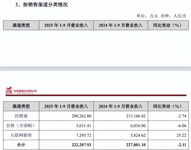 从销售渠道看,传统经销商渠道仍占绝对主力,贡献20.93亿元,占比94%,但同比下降2.74%。直销(含团购)收入5651万元,占比仅2.5%,降幅6.06%。互联网销售成为唯一正增长渠道,收入7294万元,同比增长25.22%,但基数较小,对金徽酒整体营收贡献有限。
