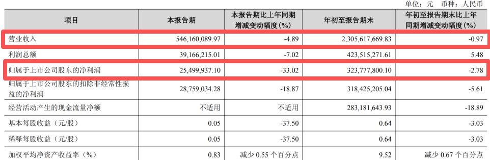 更为严峻的是第三季度单季表现——营收5.46亿元,同比下降4.89%;归母净利润仅为2549.99万元,同比大幅下滑33.02%,创下今年以来最大单季跌幅。