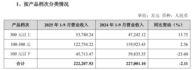 前三季度,金徽酒300元以上中高端产品实现营收5.37亿元,同比增长13.75%,占酒类营收比例约24%;100-300元价格带产品实现营收12.28亿元,同比增长2.36%,占比约55%;而100元以下产品营收4.57亿元,同比减少23.6%。
