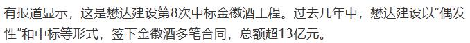 据《长沙电视台政法频道》报道,这已是懋达建设第8次中标金徽酒工程。过去几年中,懋达建设以“偶发性”和中标等形式,签下金徽酒多笔合同,总额超13亿元。