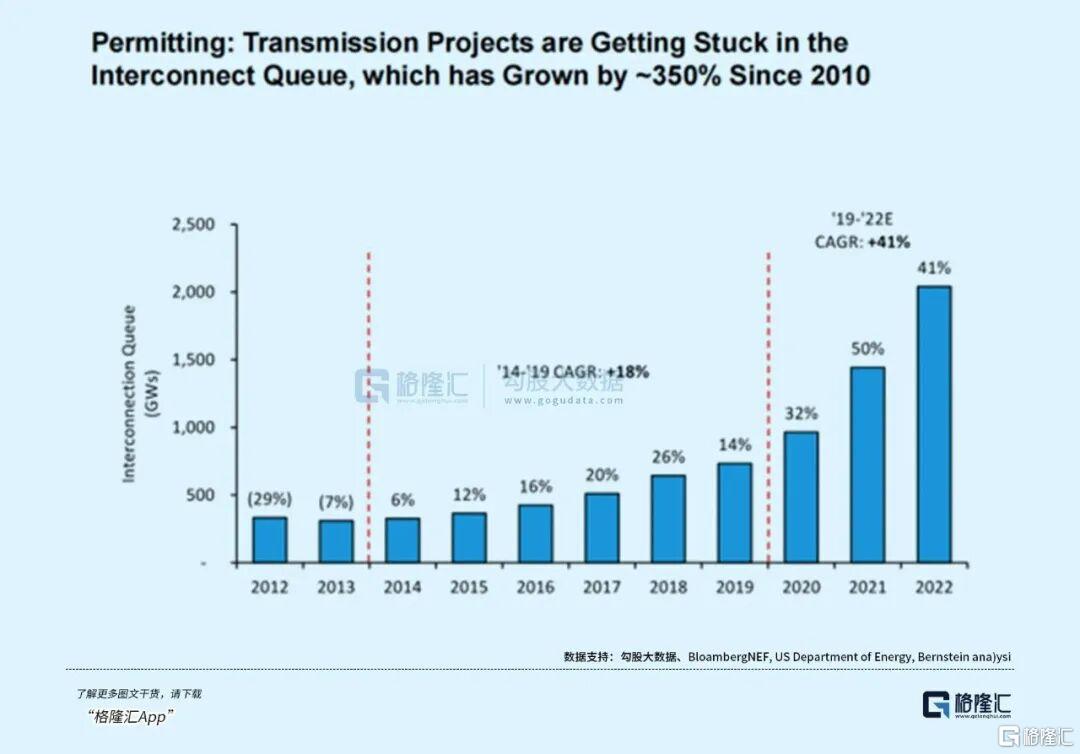 更关键的是,电网接入新能源的难度极大,美国的输电项目排队队列自2010年以来增长了350%,很多新能源电站建好了,却因为接不上电网而无法供电。