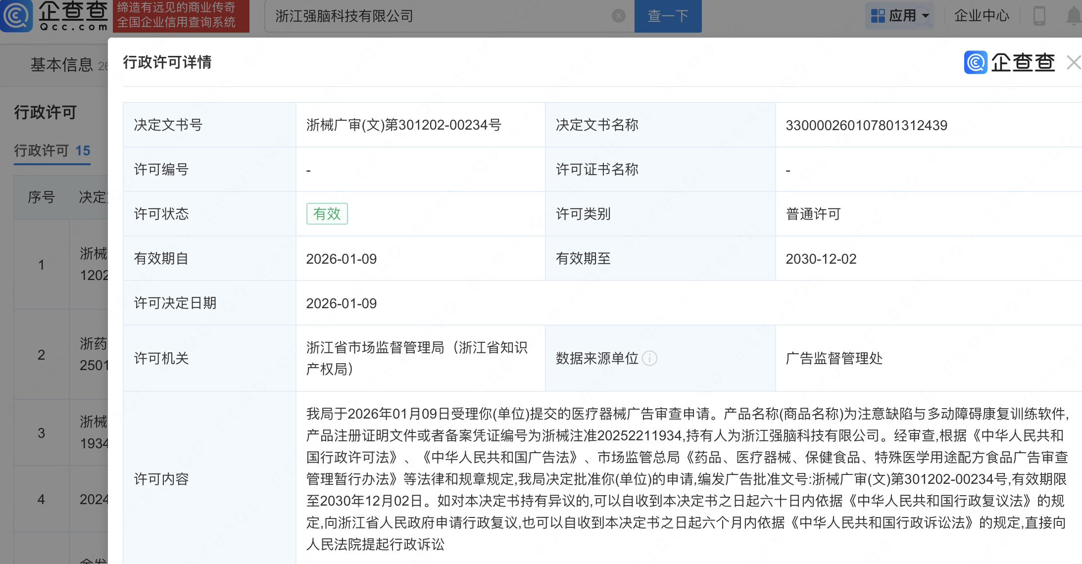 企查查APP显示,近日,浙江强脑科技有限公司“注意缺陷与多动障碍康复训练软件”医疗器械广告审查申请获批,许可机关为浙江省市场监督管理局(浙江省知识产权局)。企查查信息显示,浙江强脑科技有限公司成立于2018年,经营范围包含:人工智能行业应用系统集成服务;康复辅具适配服务;人工智能理论与算法软件开发等。