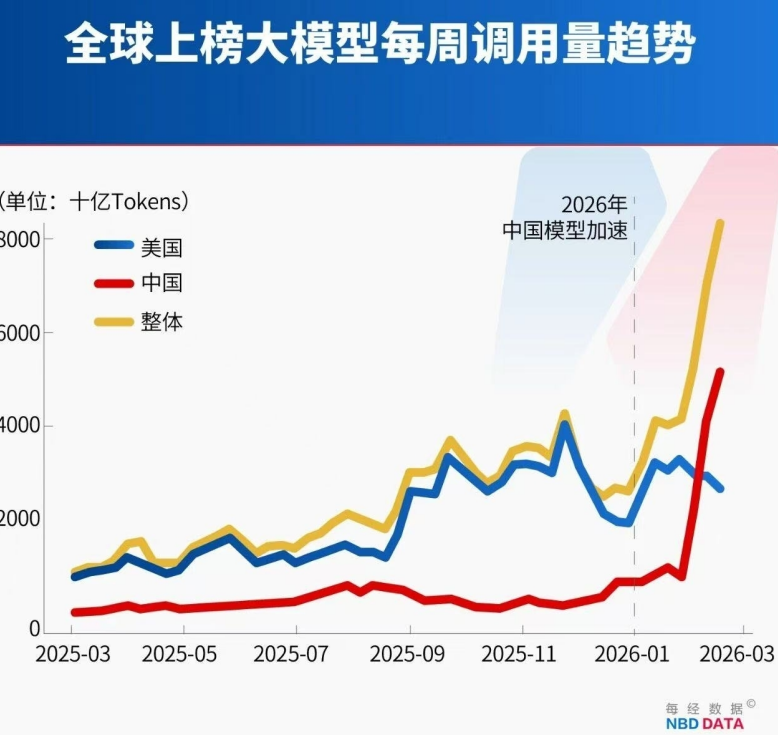 据报道,全球最大的AI模型API聚合平台OpenRouter数据显示,9日-15日这周,中国模型以4.12万亿Token的调用量,首次超过同期美国模型的2.94万亿Token,其中国内四款大模型霸榜全球前五。