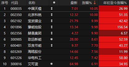 今天环保、氢能板块大涨,中国天楹、侨银股份、北京科锐、宝武镁业等多股涨停。机构认为,氢能是重要的非电利用载体,行业正在从示范试点走向规模化落地,绿氢产业具体支持政策有望密集落地,具备中长期配置价值。