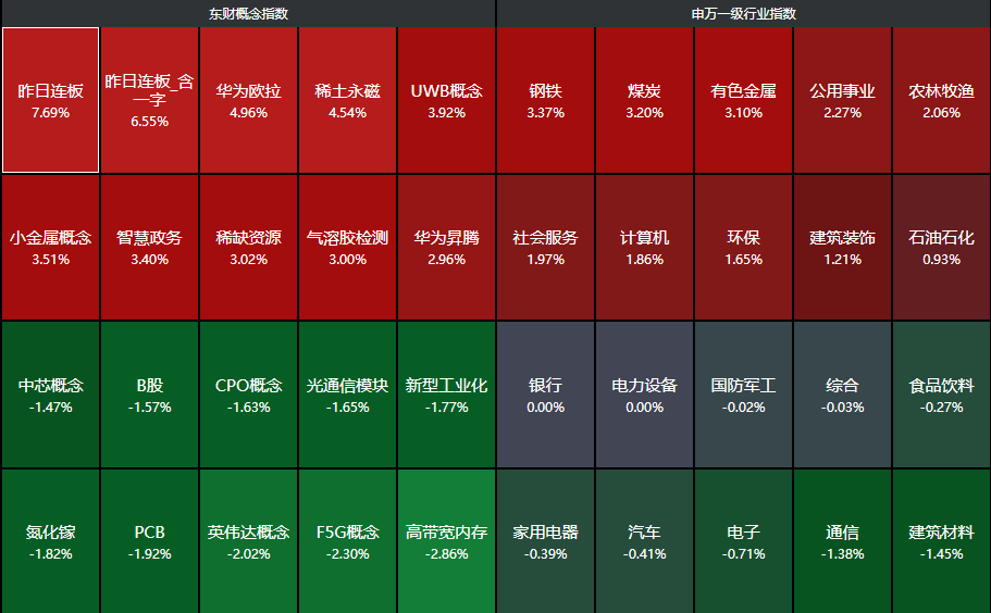 分行业来看,钢铁、煤炭、有色金属、公用事业、农林牧渔等行业领涨,建筑材料、通信、电子等行业领跌。