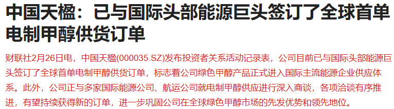 另外中国天楹表示目前已与国际头部能源巨头签订了全球首单电制甲醇供货订单,标志着公司绿色甲醇产品正式进入国际主流能源企业供应体系。