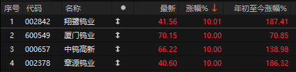 据报道,节后钨原料价格持续飙升,钨粉已突破1800元/公斤,刀具行业迎来新一轮集中涨价。今天钨矿板块掀起涨停潮,翔鹭钨业、厦门钨业、中钨高新、章源钨业齐齐涨停,并且钨矿板块年内涨幅应该是领先全市场。