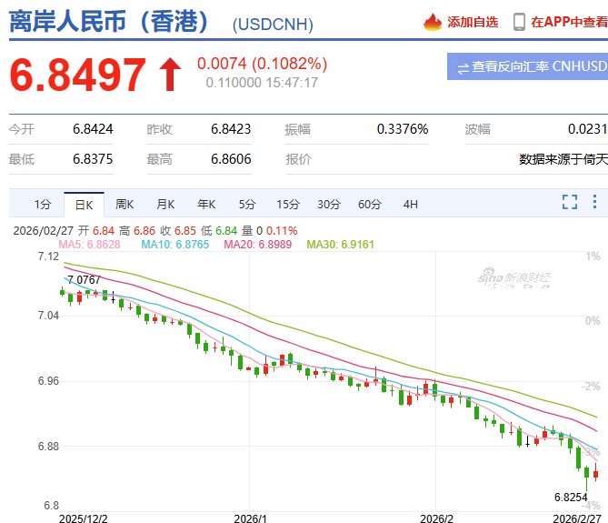 前两天我一直提示人民币汇率持续走强,今天央行终于出手降温。据报道,为促进外汇市场发展,支持企业管理好汇率风险,中国人民银行决定自2026年3月2日起,将远期售汇业务的外汇风险准备金率从20%下调至0。下一步,中国人民银行将继续引导金融机构优化对企业汇率避险服务,保持人民币汇率在合理均衡水平上的基本稳定。