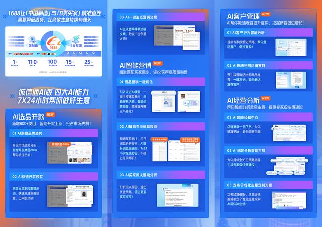3.0阶段(决策助手)的标志是2025年10月诚信通AI版的推出。这个全新的AI产品通过AI选品开款、AI智能营销、AI客户管理、AI经营分析四大核心能力,7x24小时助力生意全流程,帮助商家从传统经营向智能经营模式升级,降低中小企业生意门槛,让每个中小企业拥有自己的生意Agent。在齐晓宁看来,这个产品的核心是托管与决策。