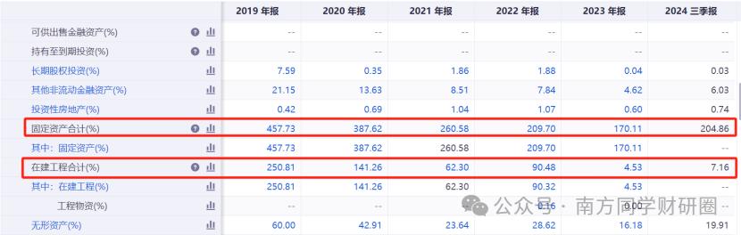 公司的资产结构也体现了重资产投入,占比较高的资产依次是固定资产(占比70%),应收款项(7%)、无形资产(6.8%)。变化较大的是前两项,固定资产从2019年的45%提升到24年三季报的70%,应收款项从占比1%提升至7%。