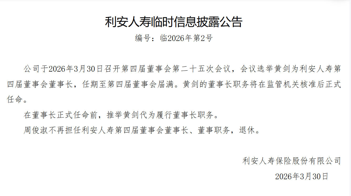 蓝鲸新闻4月1日讯(记者 陈晓娟)日前,利安人寿保险股份有限公司(下称“利安人寿”)公告称,选举黄剑为董事长。周俊淑因到龄退休,不再担任公司董事长及董事职务。