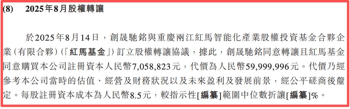 以2025年8月为例,创晟驰铭向重庆两江红马智能化产业股权投资基金合伙企业(有限合伙)(「红马基金」)转让所持阿维塔的部分股权(注册资本人民币7,058,823元),作价约为6000万元。