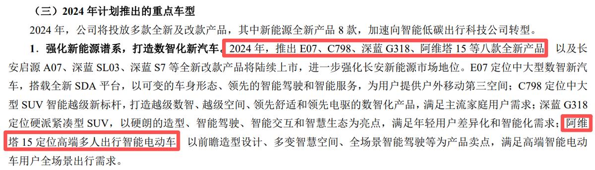 早前,长安汽车曾在2023年年报中表示,2024年将推出包括深蓝G318、阿维塔15等在内的8款全新产品。其中,阿维塔15定位高端多人出行智能电动车。但截至目前,阿维塔15并未顺利推出(注:疑似为阿维塔07,内部代号E15)。