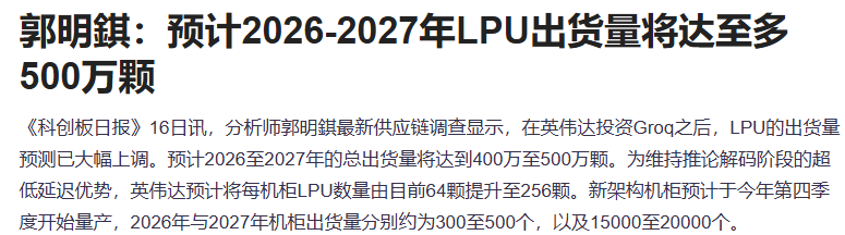 分析师郭明錤最新供应链调查显示,在英伟达投资Groq之后,LPU的出货量预测已大幅上调。预计2026至2027年的总出货量将达到400万至500万颗。为维持推论解码阶段的超低延迟优势,英伟达预计将每机柜LPU数量由目前64颗提升至256颗。新架构机柜预计于今年第四季度开始量产,2026年与2027年机柜出货量分别约为300至500个,以及15000至20000个。受该消息刺激,午盘pcb板块走强。