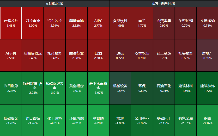 周末美伊冲突进一步升级,再加上机构策略普遍强调“滞胀预期”并看空科技板块,科技股本来近两周就跑输市场,再加上周末被看空,悲观情绪可谓是到了一个冰点。今天开盘后白酒、农业等低位防守板块走强,科技、有色大跳水,直到临近早盘收盘,存储板块走强,带动科技股情绪回升,午盘开盘华虹公司爆拉,一度涨超16%,带动科技股进一步反弹。但由于油价还在高位,市场还不至于一步到位risk-on,所以也不敢进一步上攻,今晚局势是否缓和很关键。