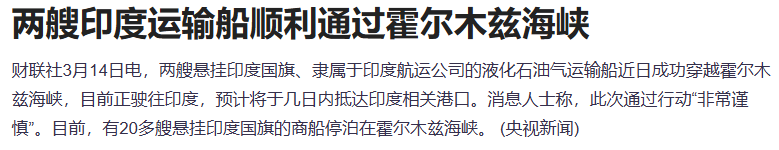 两艘悬挂印度国旗、隶属于印度航运公司的液化石油气运输船近日成功穿越霍尔木兹海峡,目前正驶往印度,预计将于几日内抵达印度相关港口。