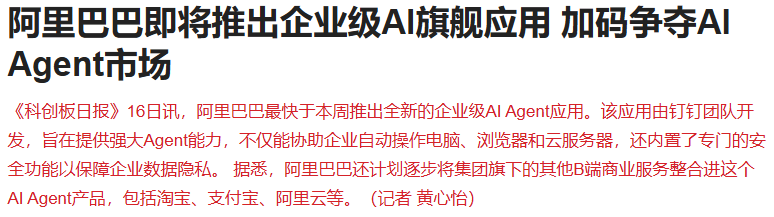 据报道,阿里巴巴最快于本周推出全新的企业级AI Agent应用。该应用由钉钉团队开发,旨在提供强大Agent能力,不仅能协助企业自动操作电脑、浏览器和云服务器,还内置了专门的安全功能以保障企业数据隐私。